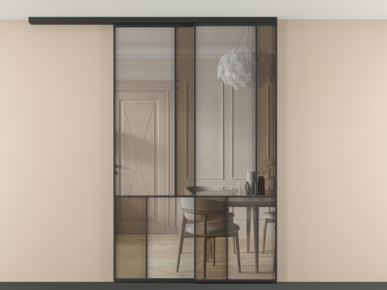 Во всех алюминиевых перегородках, независимо от типа установки, используется компланарный раздвижной механизм, благодаря которому декоративная крышка и полотно находятся в одной плоскости.